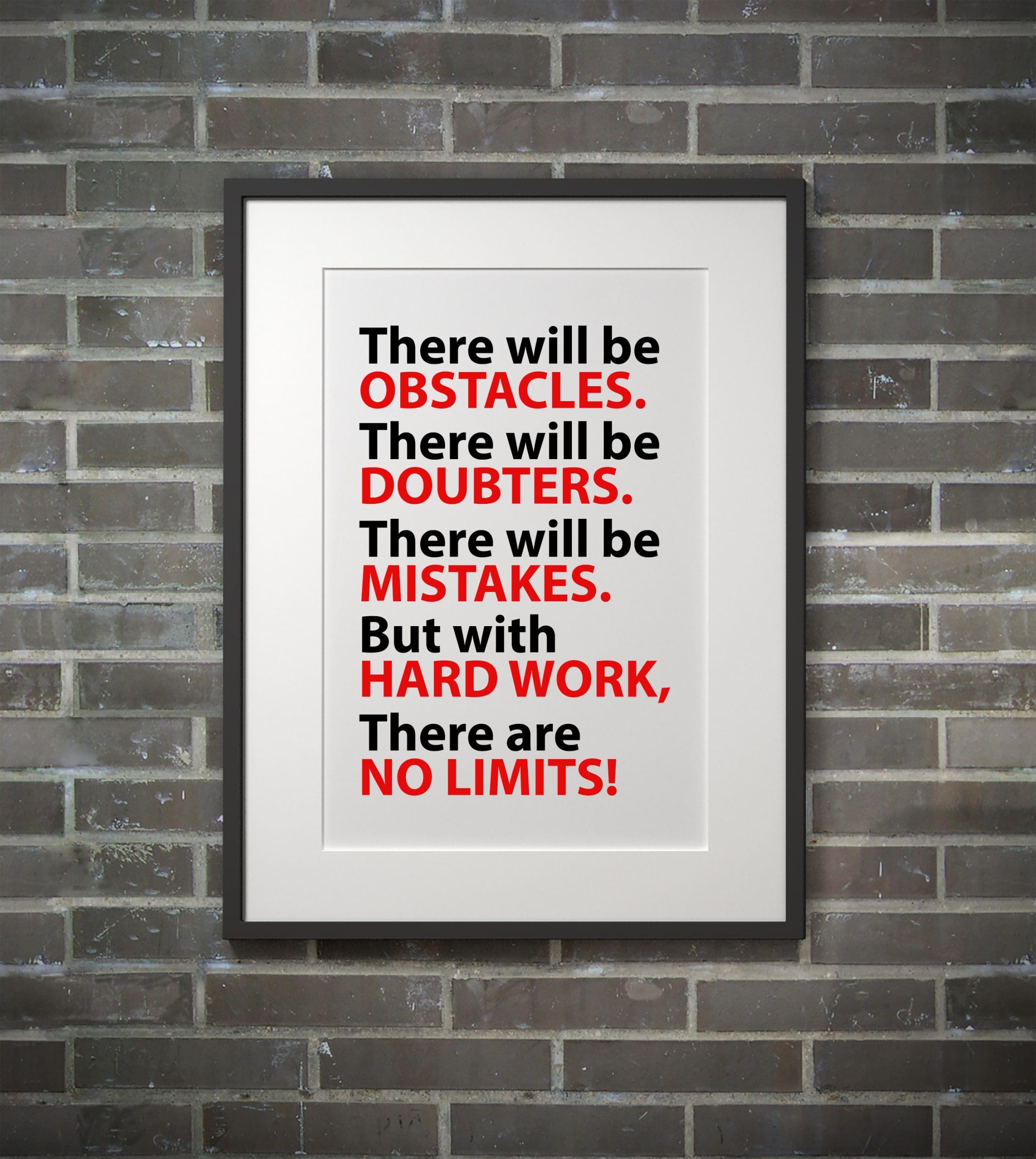 Inspirational quote on picture frame over a dirty brick wall. THERE WILL BE OBSTACLES. THERE WILL BE DOUBTERS. THERE WILL BE MISTAKES. BUT WITH HARD WORK, THERE ARE NO LIMITS.