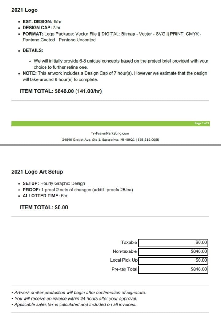 This estimate is going to include a full breakdown of your design process. The est consists of how many hours we think it will take to create your logo design and a design cap, along with what types of files you will receive at the end of the design process. In addition, it will have a space for any details that may be important for your logo design process, such as how many initial logo design options we will create and what the total cost of the project will be.