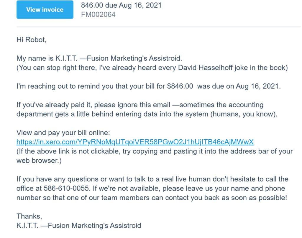 You will receive invoice reminders throughout the process from our automated system, K.I.T.T. These reminders are just as much for you as they are for us, and we try to keep it as lighthearted as possible.