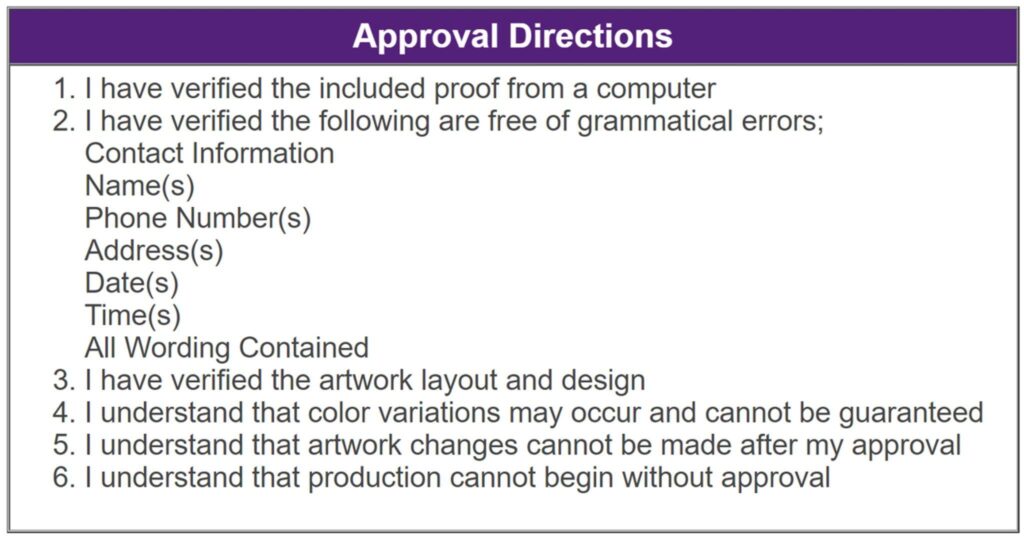 When verifying your art, it is essential to take note of everything that you see. You’ll want to double-check grammar, dates, business info, wording, artwork, and colors (colors may vary based on your computer.)