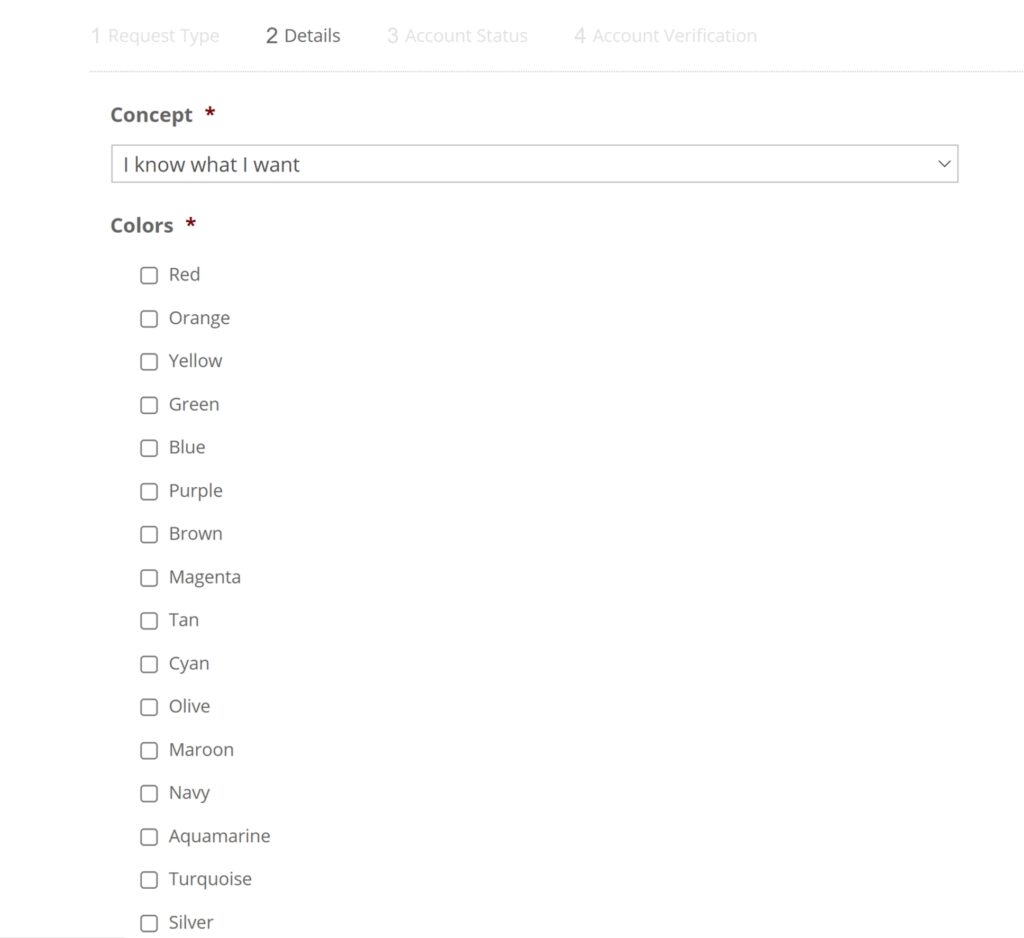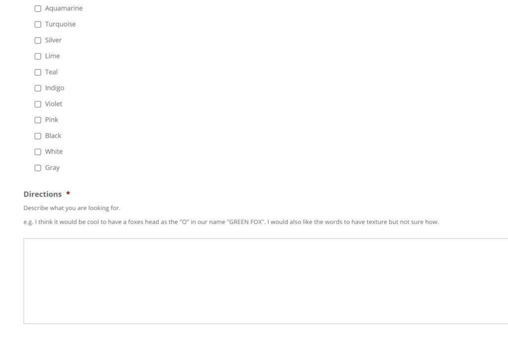 If you know what you are looking for in design concepts or you have rough ideas, you will choose “I know what I want.” This will then populate a list of colors, a box for you to write your directions down to the minor details, and another option to upload a file.
