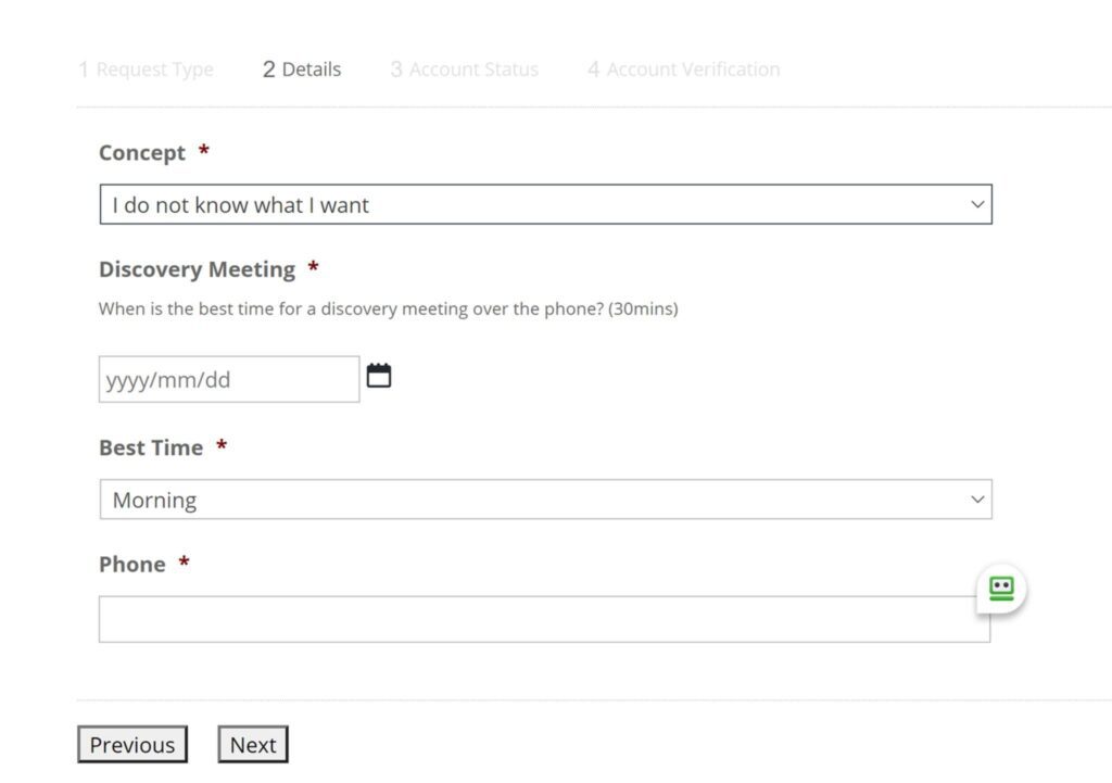 On this page, in the “concept” drop-down, highlighting “I don’t know what I want,” will bring up options to set up a meeting for the discovery phase. You will then fill in the best date and time for a 30-minute session with us. Don’t forget to fill in the best phone number to reach you!