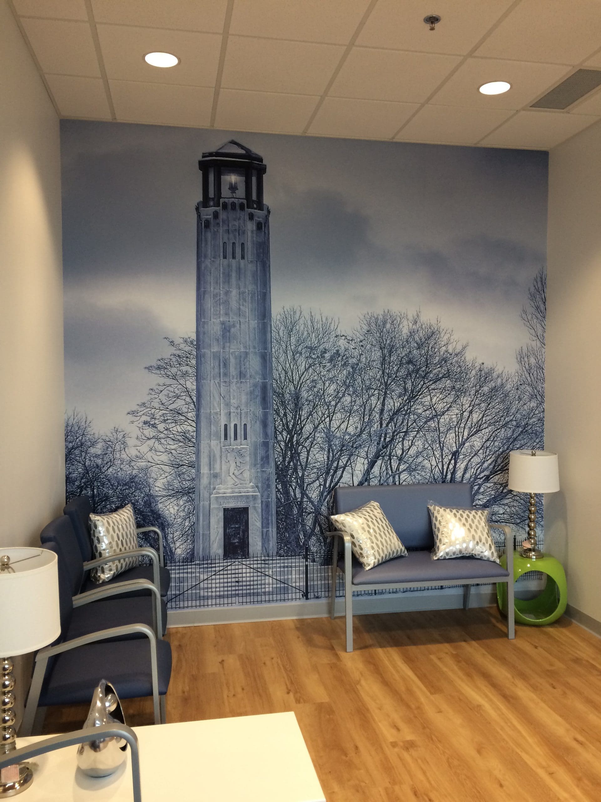 Dental Works opened new locations and wanted to visually rebrand their waiting rooms. They chose to go with Iconic MI / Detroit imagery with a Blue filter over the image. The blue toned filter greatly reduces stress and anxiety. Blue is known for having tranquil relaxing effects. Next time you visit a Dental Works office get ready to kick your feet up and relax stress-free while waiting for the dentist.