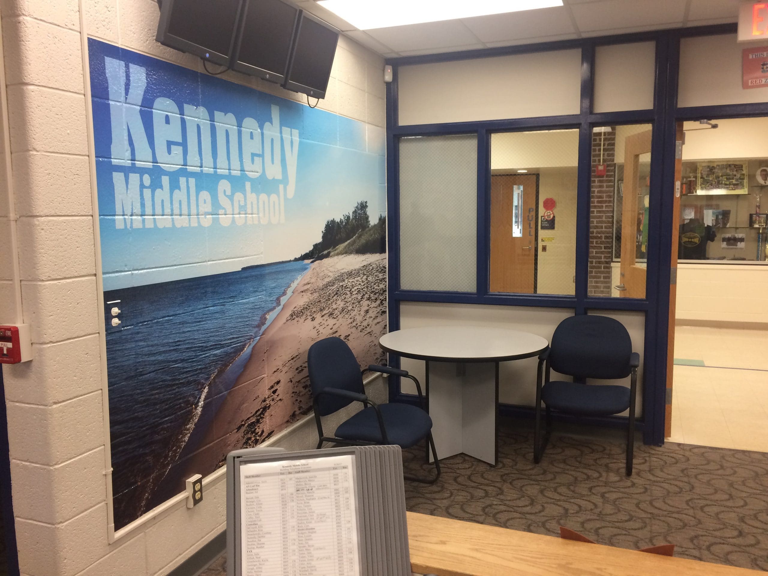 Kennedy Middle School was looking to liven up their disciplinary office with some sort of visual to offset the negative mood. So they came to Fusion for a solution. We proposed a calming Great Lakes Michigan beach scene. So we ended up doing a wide format latex printed wall mural that adhered directly to the painted cinder block. They loved the idea and when you are in the office it actually feels like you are on the beach!!