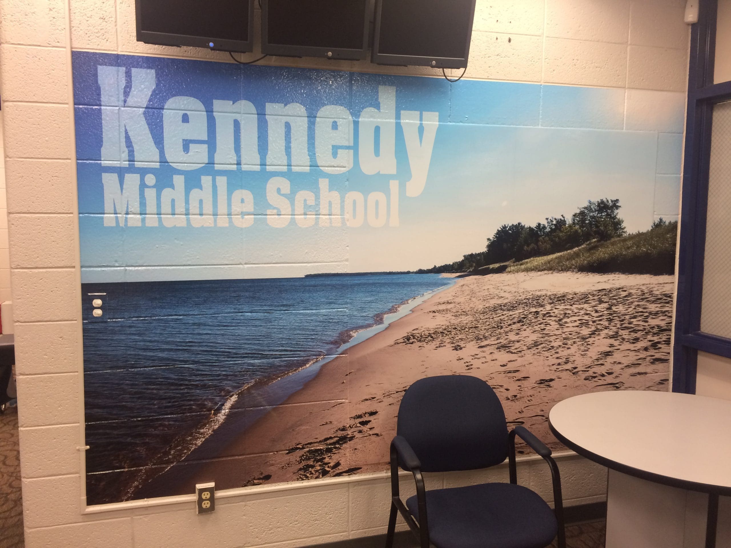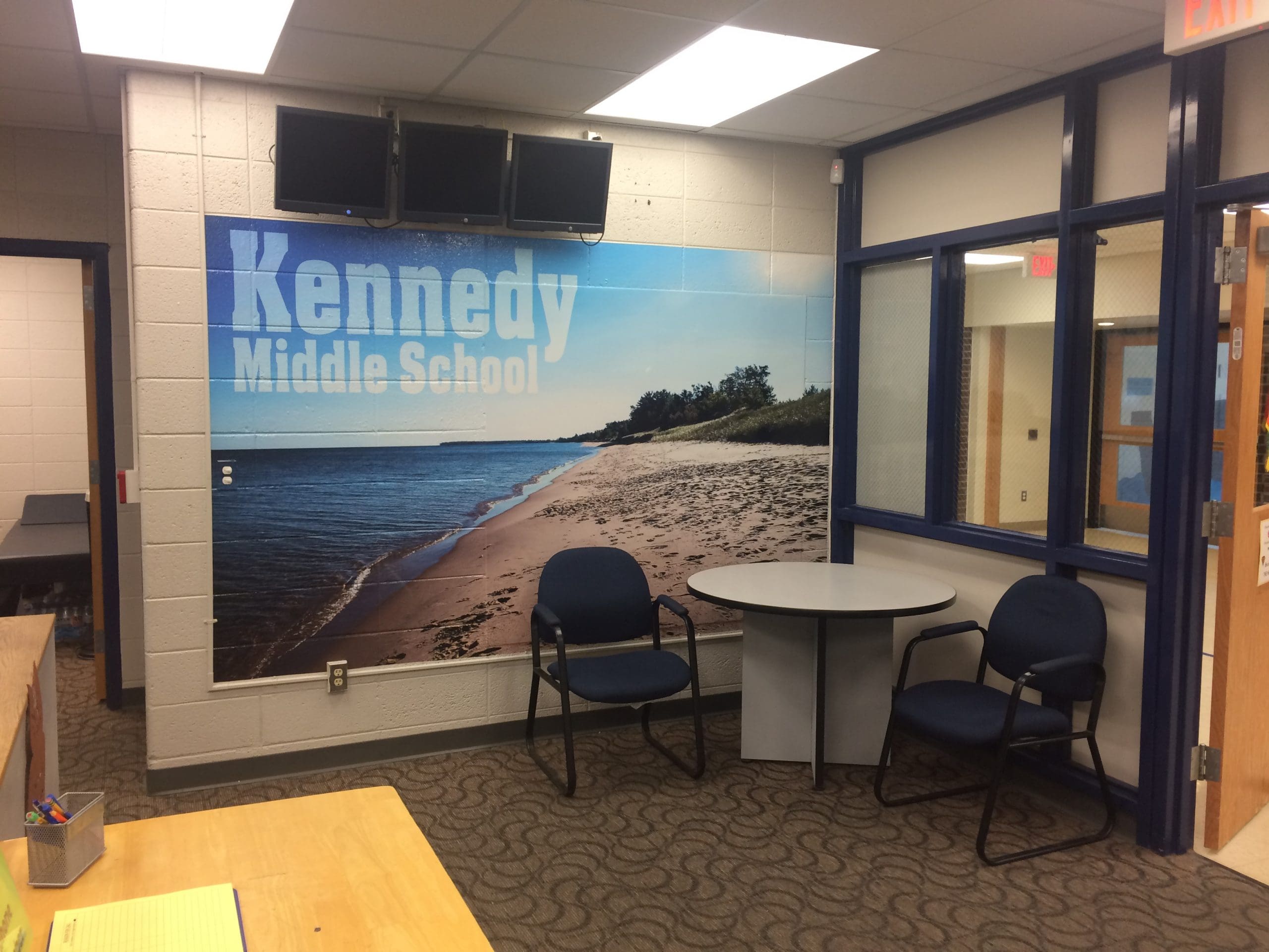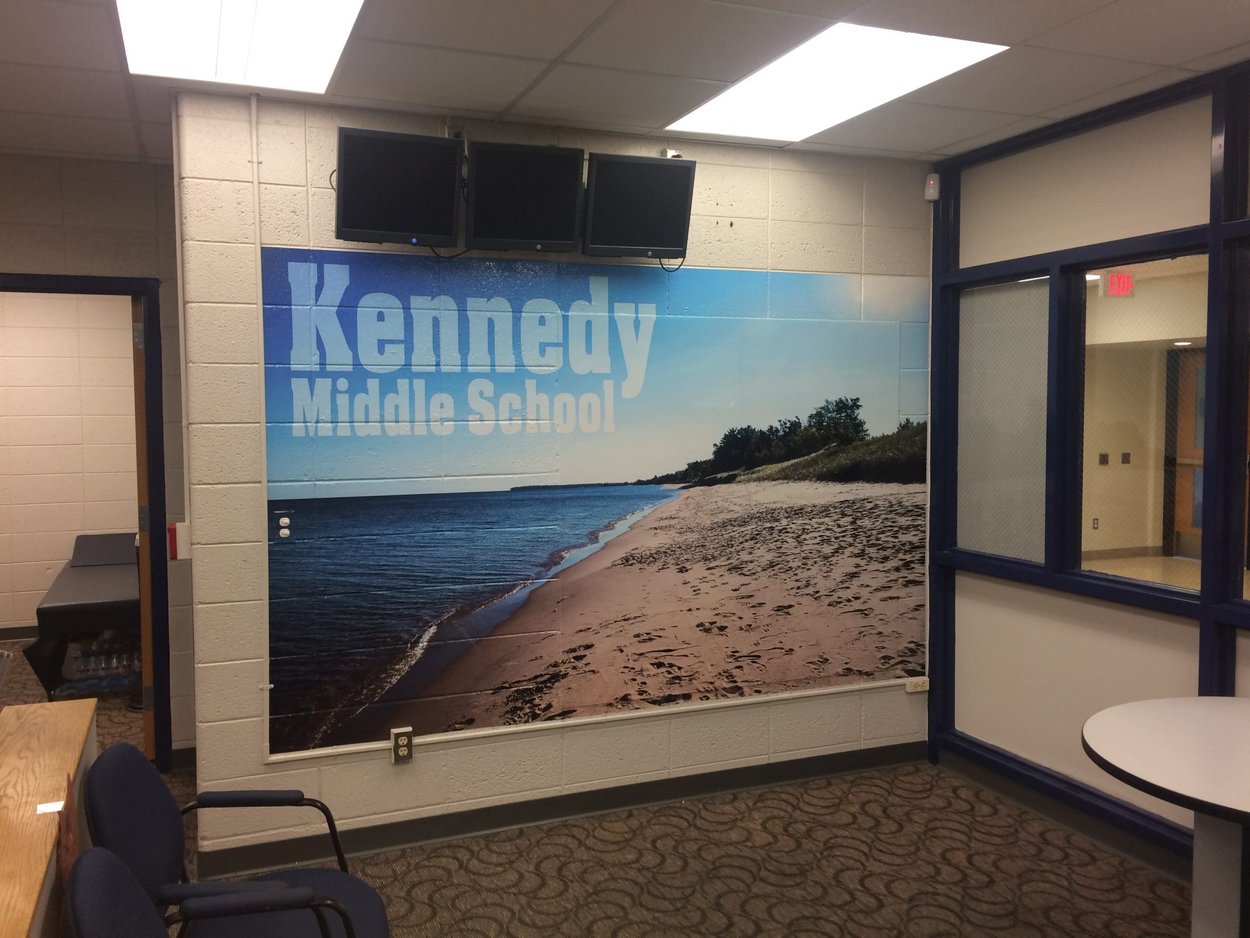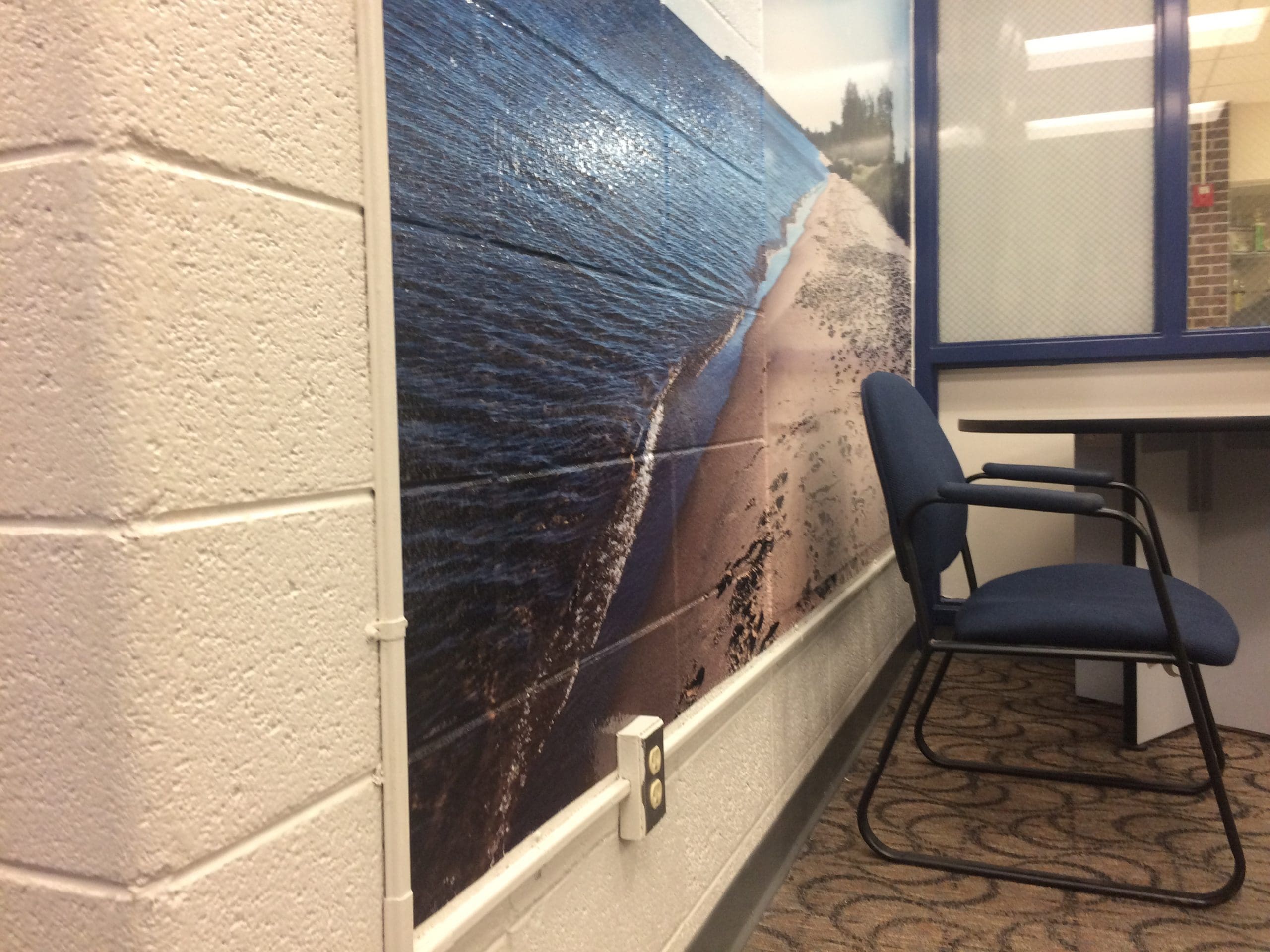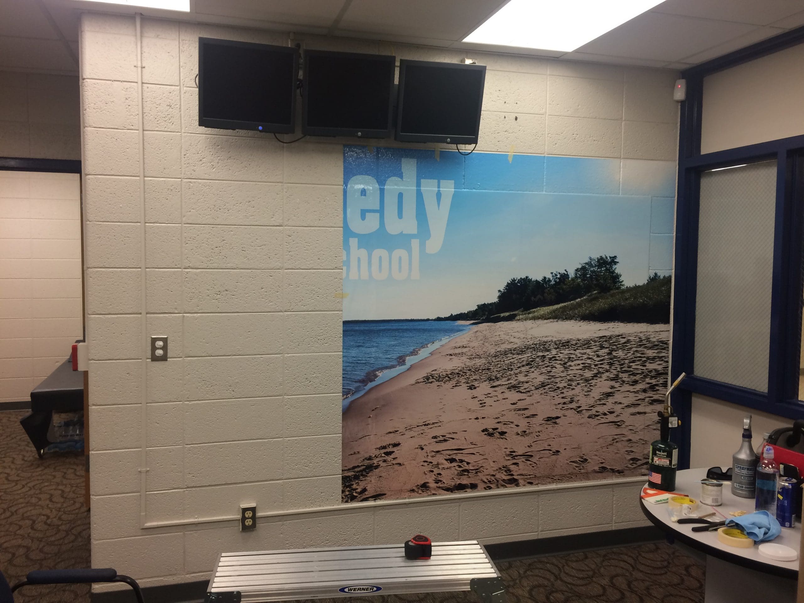 Kennedy Middle School was looking to liven up their disciplinary office with some sort of visual to offset the negative mood. So they came to Fusion for a solution. We proposed a calming Great Lakes Michigan beach scene. So we ended up doing a wide format latex printed wall mural that adhered directly to the painted cinder block. They loved the idea and when you are in the office it actually feels like you are on the beach!!