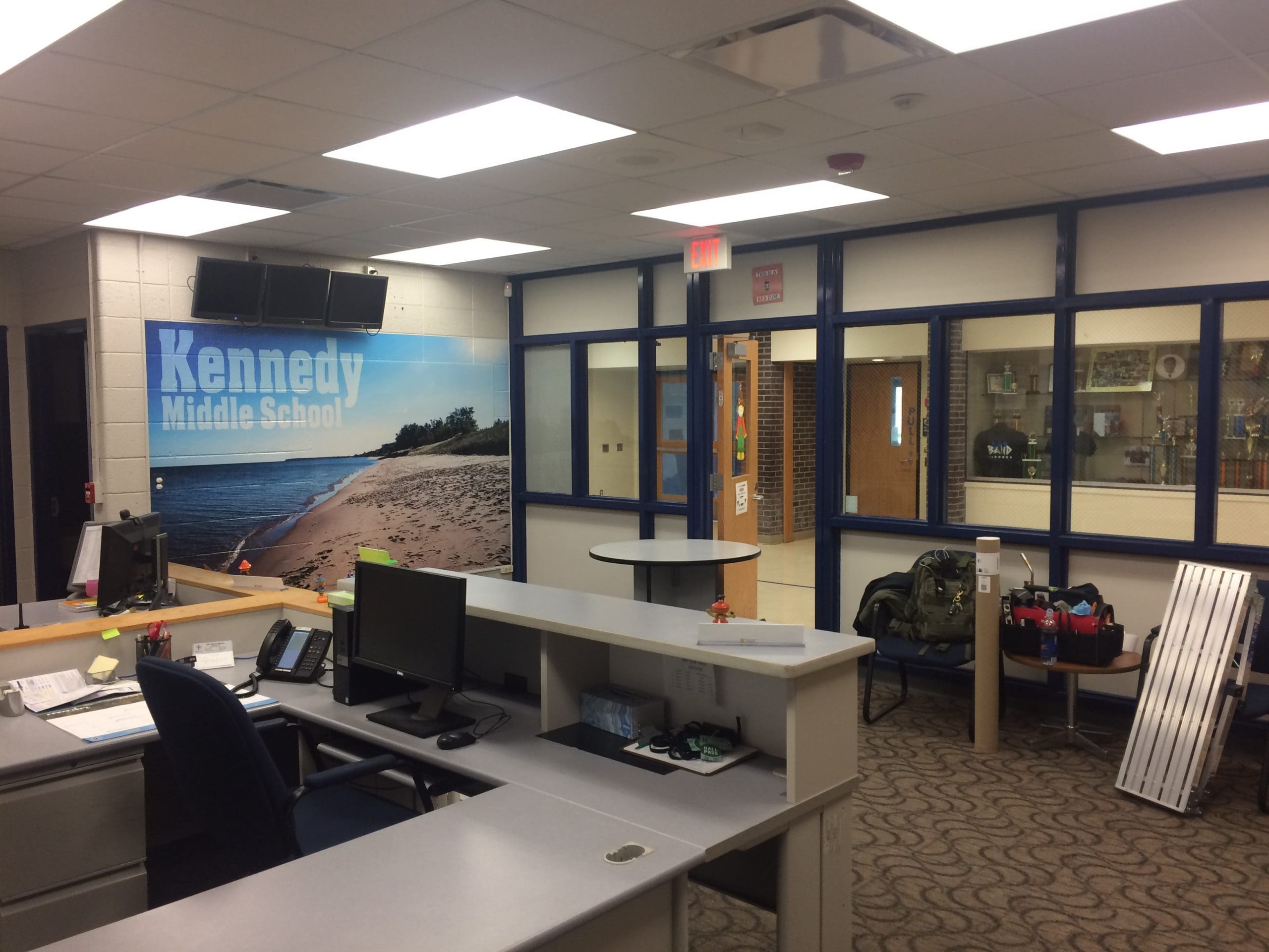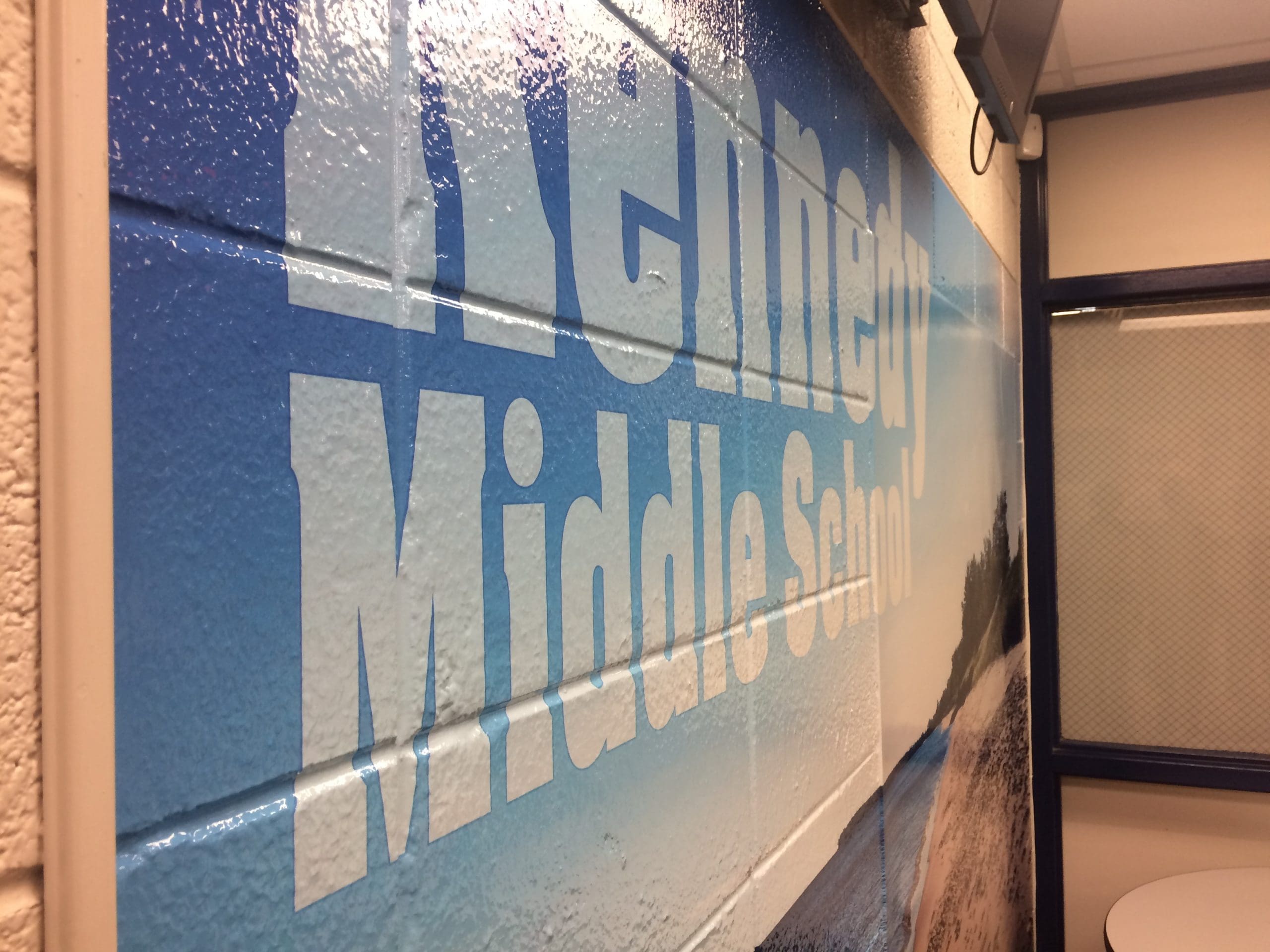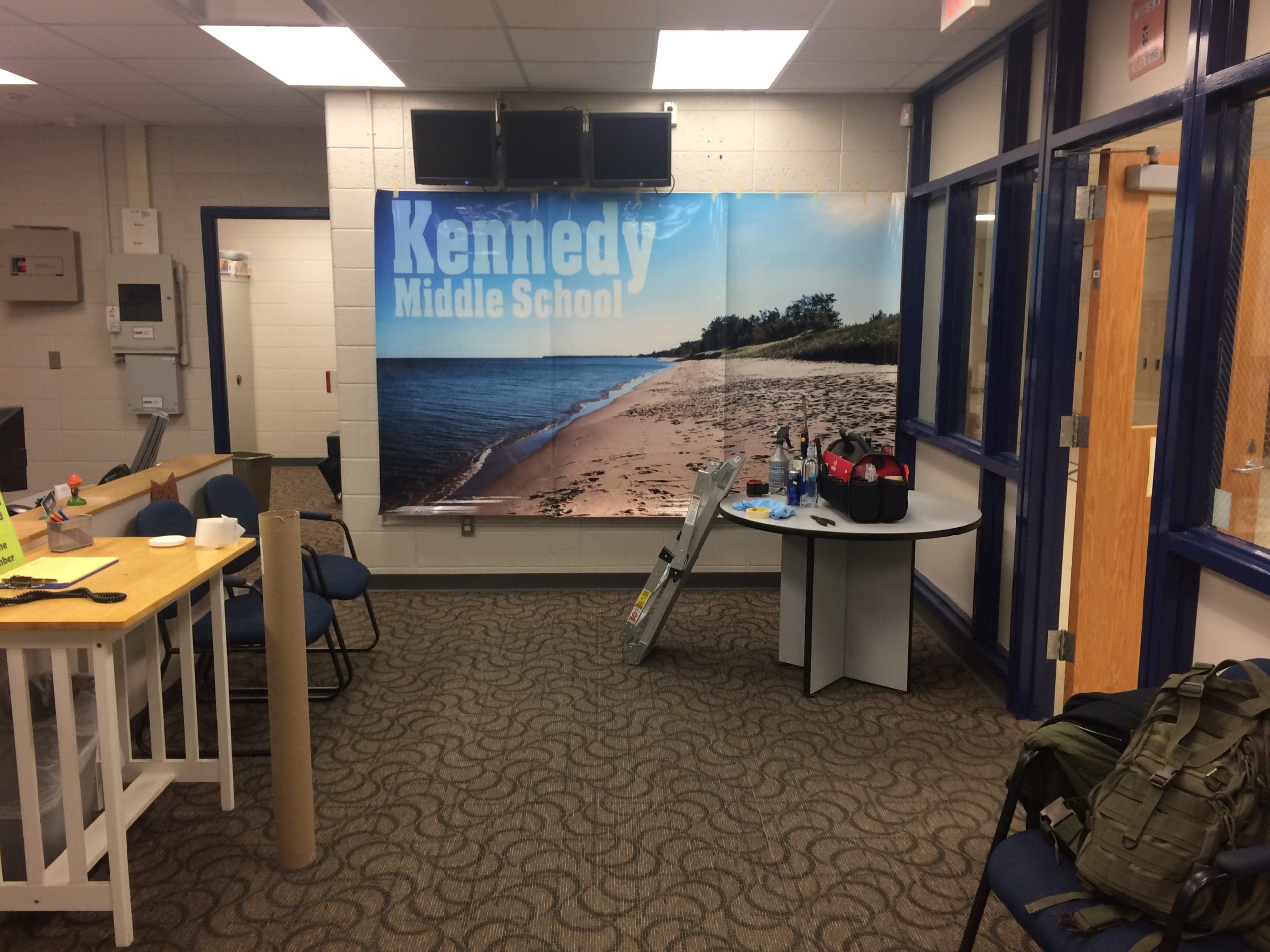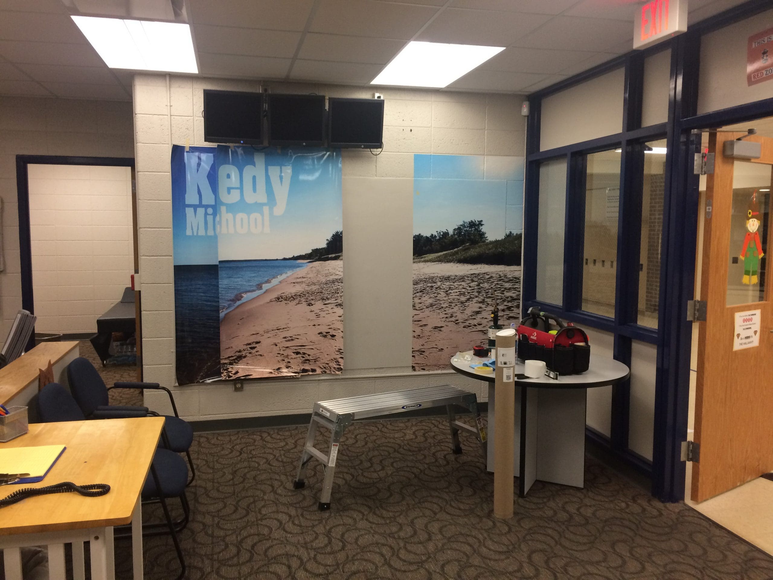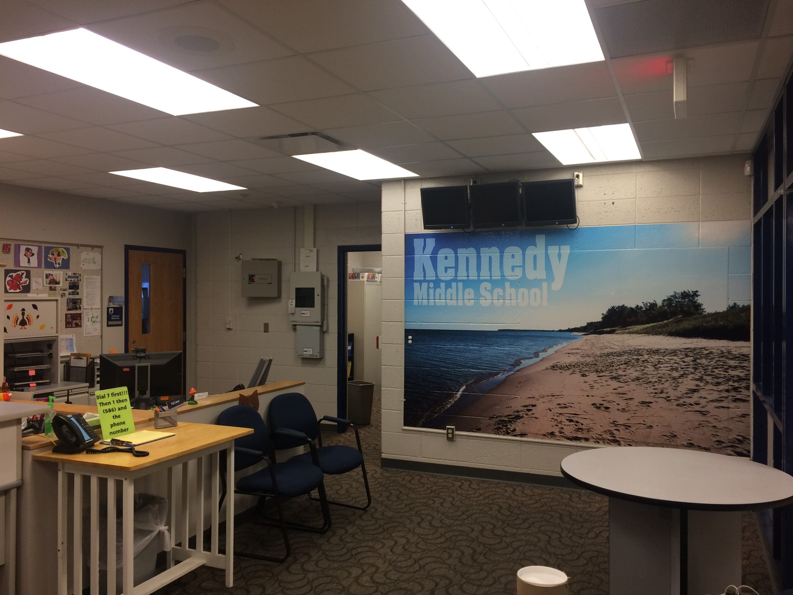 Kennedy Middle School was looking to liven up their disciplinary office with some sort of visual to offset the negative mood. So they came to Fusion for a solution. We proposed a calming Great Lakes Michigan beach scene. So we ended up doing a wide format latex printed wall mural that adhered directly to the painted cinder block. They loved the idea and when you are in the office it actually feels like you are on the beach!!