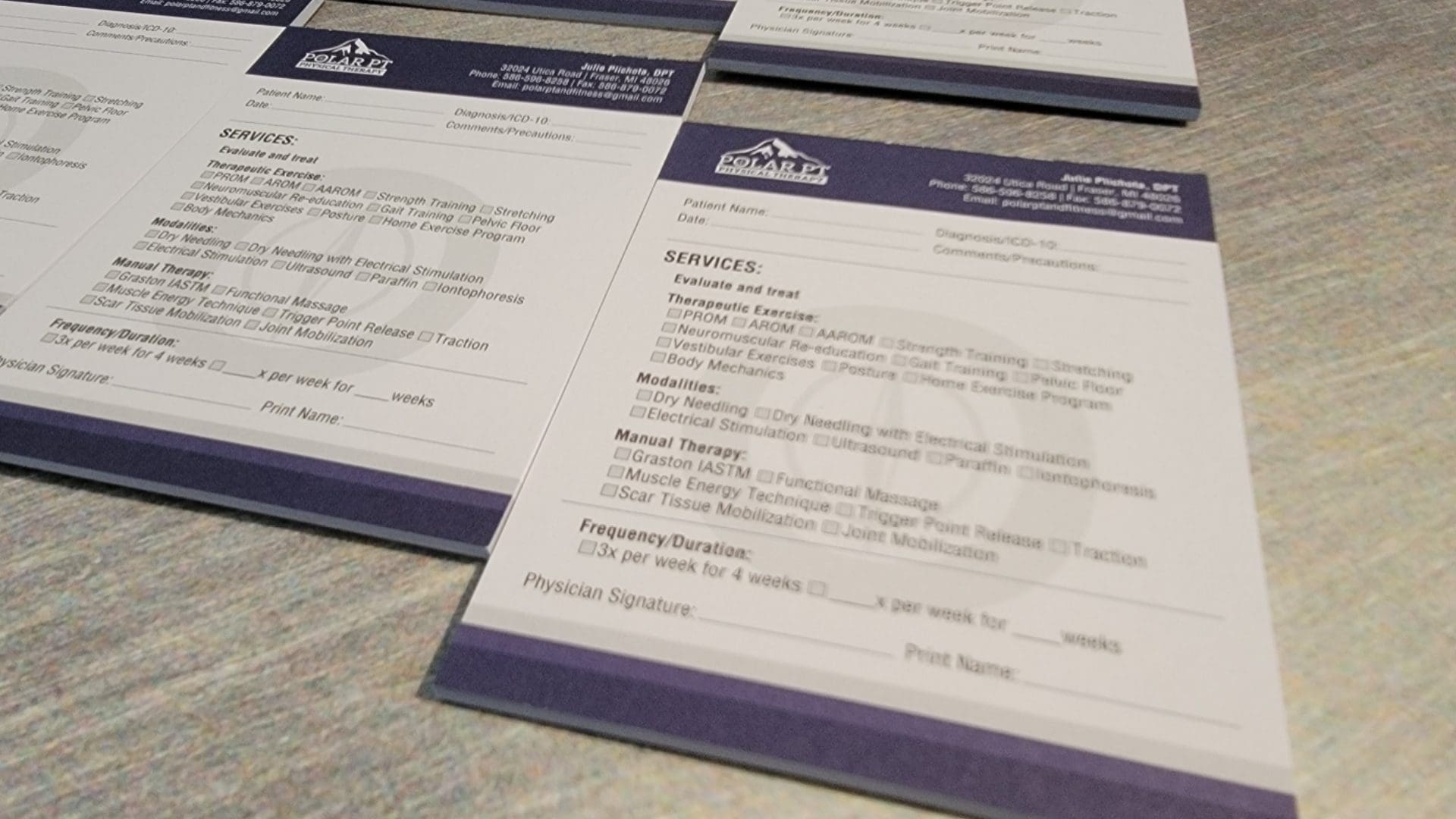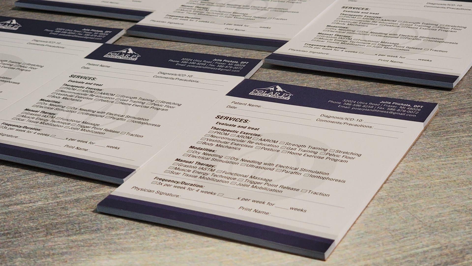 At Fusion Marketing, we took the time to understand the unique needs of our client, Polar Physical Therapy and Fitness. We determined that custom referral notepads were the best way to streamline the referral process for doctors. Through our expertise and creativity, we designed and printed referral notepads with checkboxes for the most common wants from their referral partners. This efficient solution increased referrals for Polar PT by getting their logo in front of those who decide where to refer clients in need of PT.